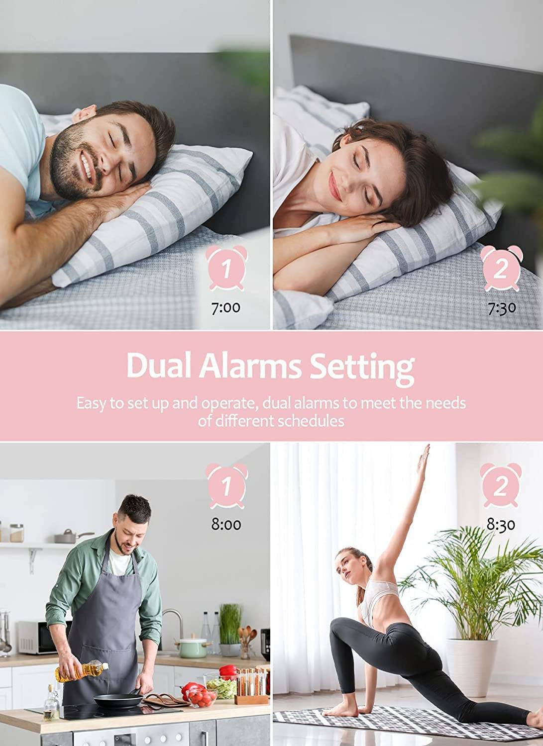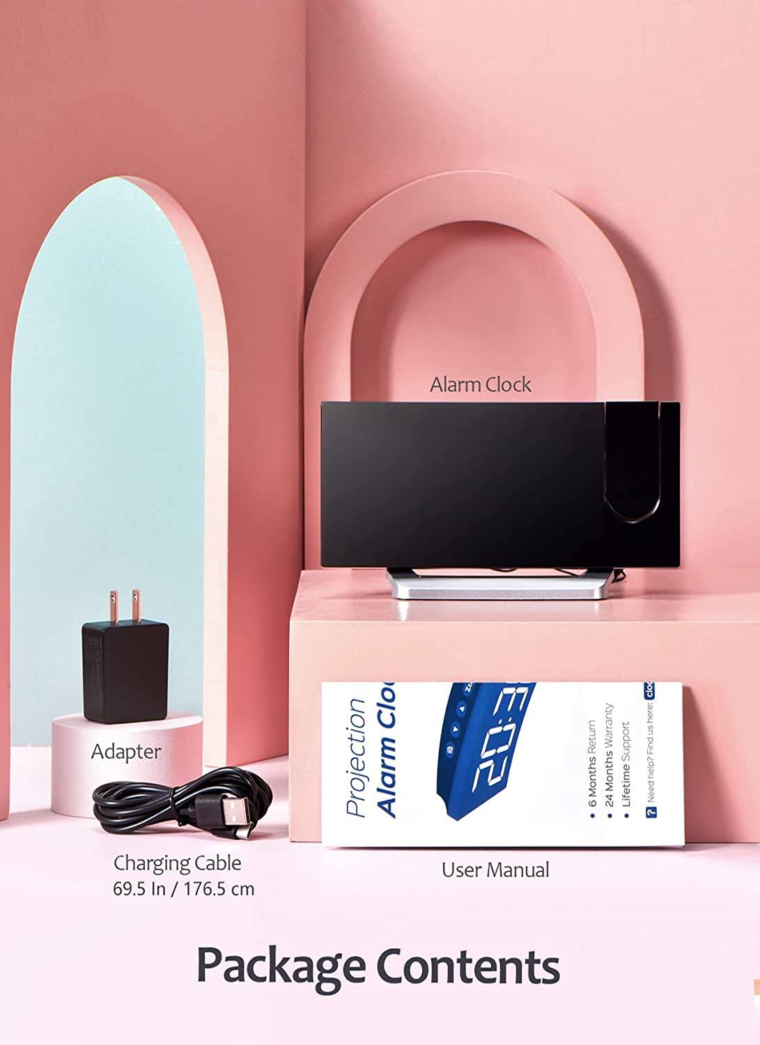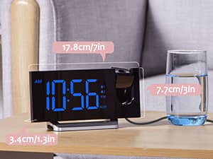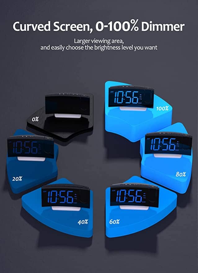 This alarm clock is amazing, it literally does it all. This alarm clock is perfect if you get distracted by your phone on your bed at night. The projector feature is revolutionary, no more blinding your eyes when checking the time in the middle of the night. With its ability to play music, dim up or down, and its curved display screen. This is the perfect bedside companion!